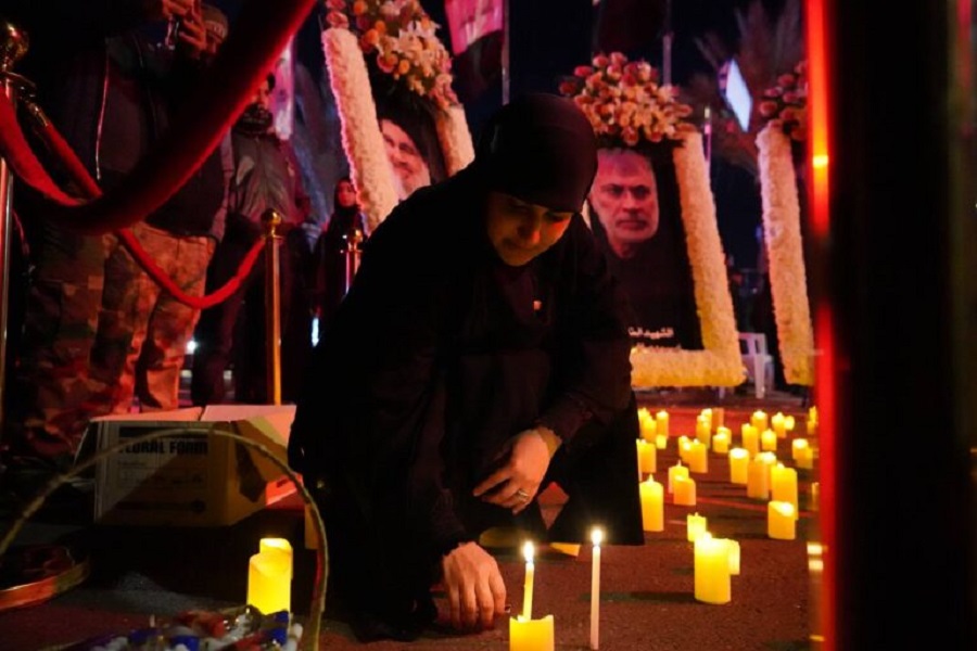 أشعل جموع من المعزين المشاركين بإحياء ذكرى استشهاد قادة النصر الشموع في موقع عروج أرواح القادة الشهداء ورفاقهم في شارع الشهيد أبو مهدي المهندس (شارع المطار) قرب مطار بغداد الدولي.