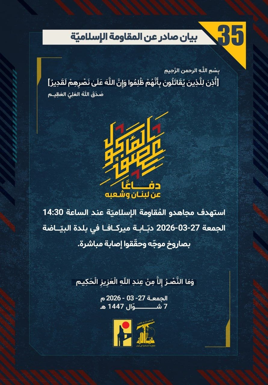 المقاومة الإسلامية بيان رقم (35): استهدفنا عند الساعة 14:30 الجمعة 27-03-2026 دبّابة ميركافا في بلدة البيّاضة بصاروخ موجّه وحقّقوا إصابة مباشرة