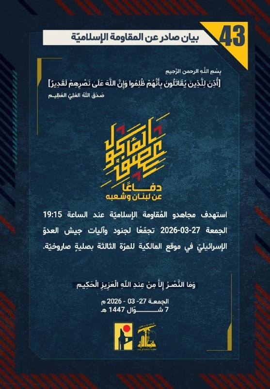 المقاومة الإسلامية بيان رقم (43): استهدفنا تجمّعًا لجنود وآليات جيش العدو "الإسرائيلي" في موقع المالكية للمرّة الثالثة بصلية صاروخية