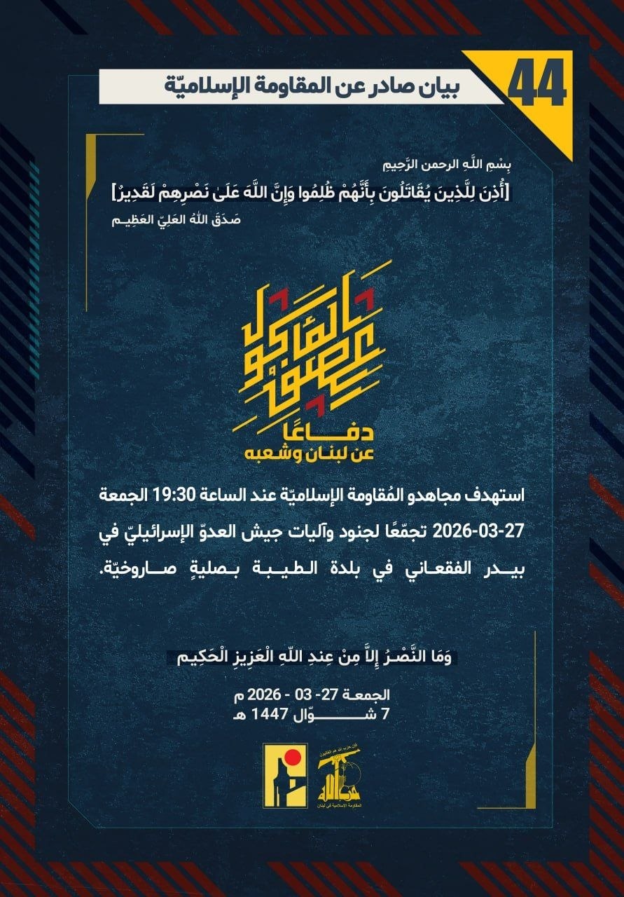 المقاومة الإسلامية بيان رقم (44): استهدفنا تجمّعًا لجنود وآليات جيش العدو "الإسرائيلي" في بيدر الفقعاني في بلدة الطيبة بصلية صاروخية