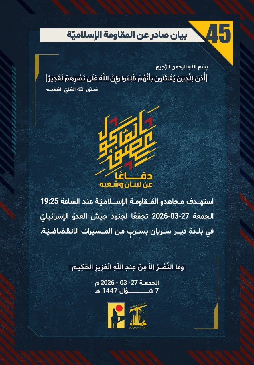 المقاومة الإسلامية بيان رقم (45): استهدفنا تجمّعًا لجنود جيش العدو "الإسرائيلي" في بلدة دير سريان بسرب من المُسيَّرات الانقضاضية