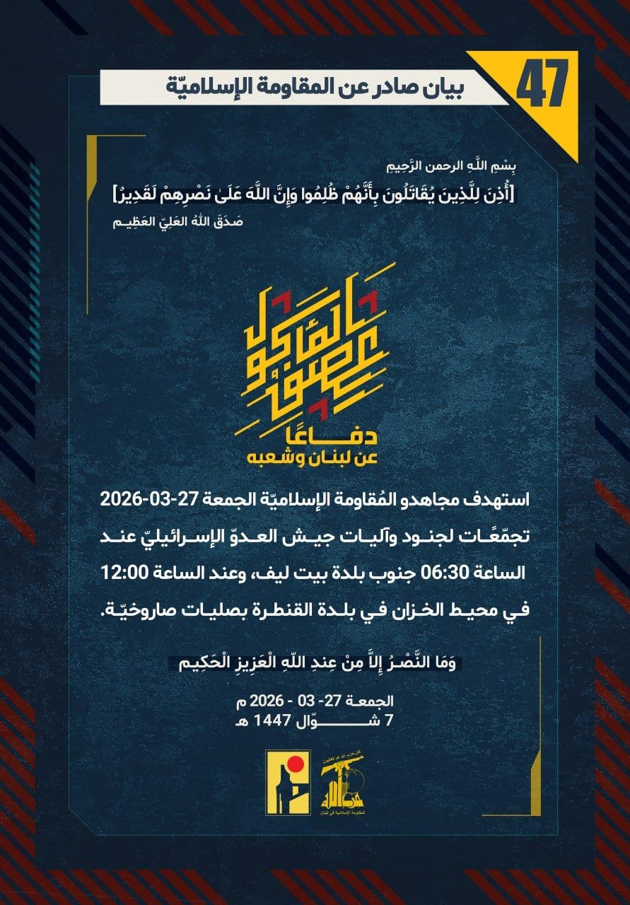المقاومة الإسلامية بيان رقم (47): استهدفنا تجمّعًات لجنود وآليات جيش العدوّ الإسرائيليّ عند الساعة 06:30 جنوب بلدة بيت ليف وعند الساعة 12:00 في محيط الخزان في بلدة القنطرة بصليات صاروخيّة