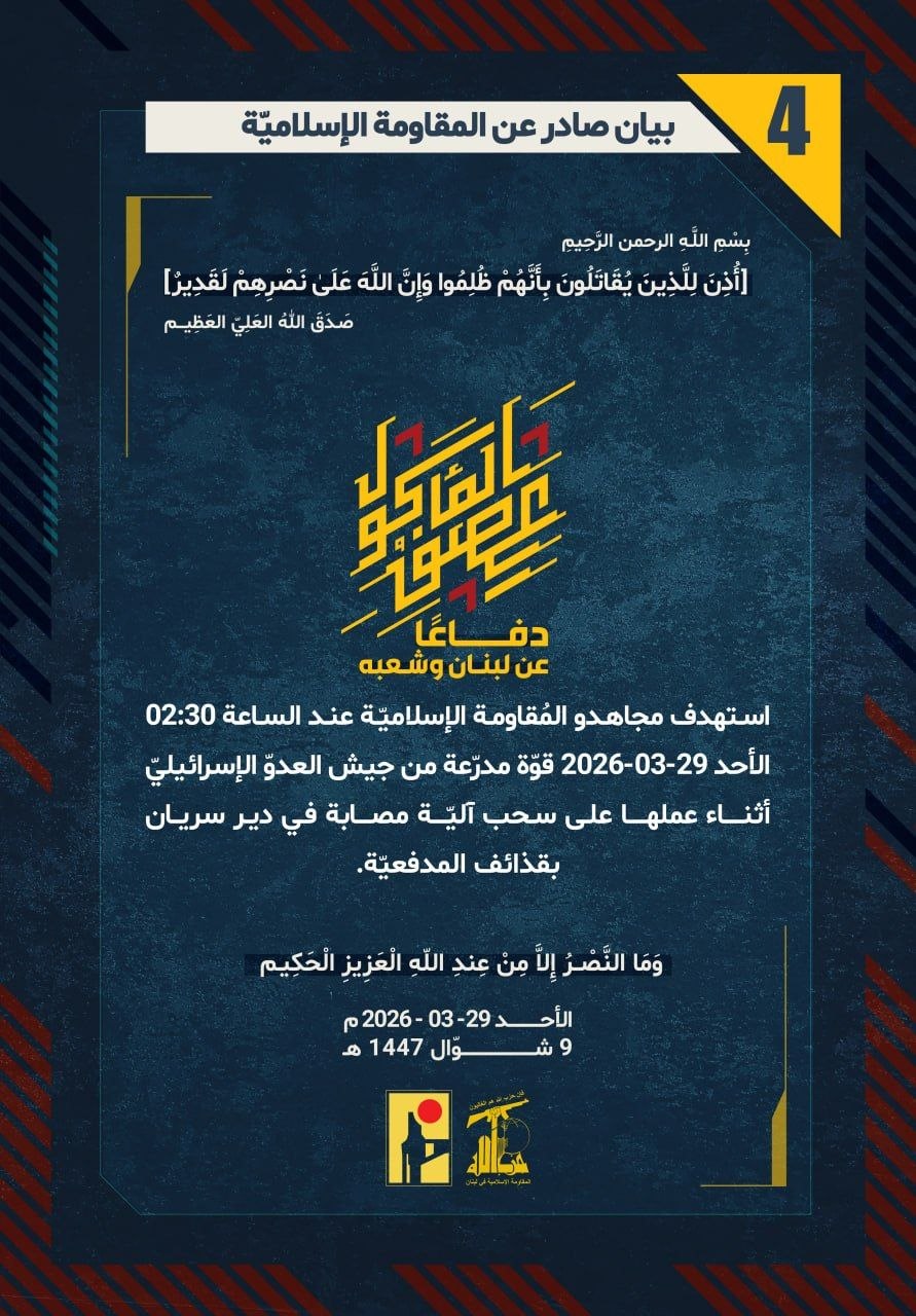 دفاعًا عن لبنان وشعبه، استهدف مجاهدو المُقاومة الإسلاميّة عند الساعة 02:30 الأحد 29-03-2026 قوّة مدرّعة من جيش العدوّ الإسرائيليّ أثناء عملها على سحب آليّة مصابة في دير سريان بقذائف المدفعيّة.