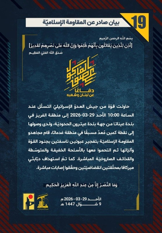المقاومة الإسلامية بيان رقم (19): فجّرنا عبوتين ناسفتين بقوّة من جيش العدو "الإسرائيلي" وآلياتها عند نقطة كمين مُعَدْ مسبقًا للقوة في منطقة غدماثا خلال محاولتها التسلّل إلى منطقة الفريز في بلدة عيناتا من جهة بلدة عيترون الحدوديّة، ثم التحم مجاهدونا مع القوة بالأسلحة الخفيفة والمتوسّطة والقذائف الصاروخيّة المباشرة، واستهدفنا دبّابتَي "ميركافا" بمحلّقتين انقضاضيّتين وحققنا إصابات مباشرة