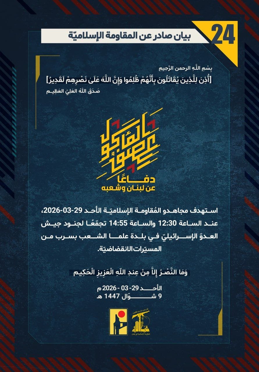 بيان صادر عن المقاومة الإسلامية (24): استهدفنا عند الساعة 12:30 والساعة 14:55 تجمّعًا لجنود جيش العدوّ "الإسرائيليّ" في بلدة علما الشعب بسرب من المسيّرات الانقضاضيّة