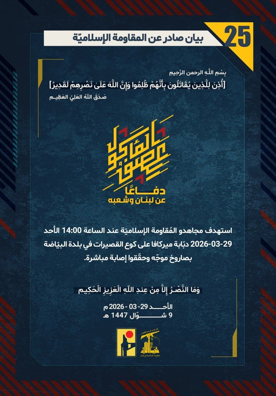 المقاومة الإسلامية بيان رقم (25): استهدفنا عند الساعة 14:00 الأحد 29-03-2026 دبّابة ميركافا على كوع القصيرات في بلدة البيّاضة بصاروخ موجّه وحقّقوا إصابة مباشرة