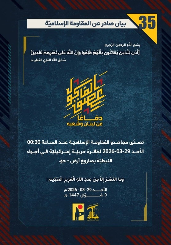 المقاومة الإسلاميّة بيان رقم (35): تصدّينا لطائرة حربية "إسرائيلية" في أجواء مدينة النبطية بصاروخ أرض - جو