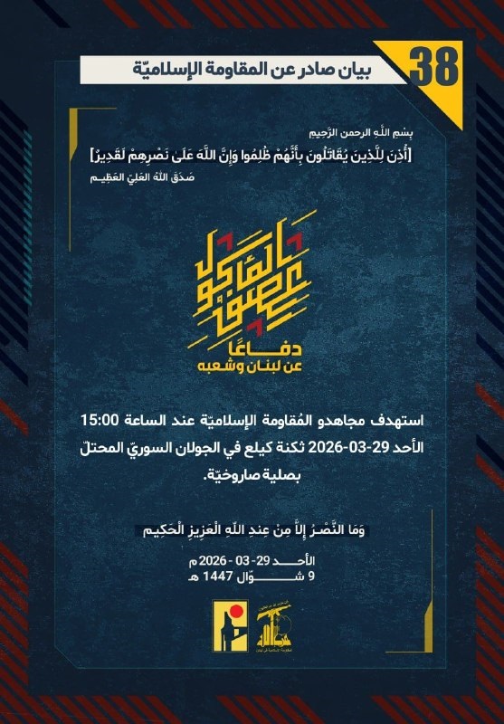 المقاومة الإسلاميّة بيان رقم (38): استهدفنا ثكنة "كيلع" في الجولان السوري المحتل بصلية صاروخية