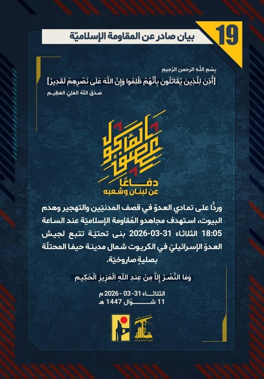 المقاومة الإسلامية بيان رقم (19): استهدفنا بُنَى تحتيّة تتبع لجيش العدو "الإسرائيلي" في "الكريوت" شمال مدينة حيفا المحتلّة بصلية صاروخية