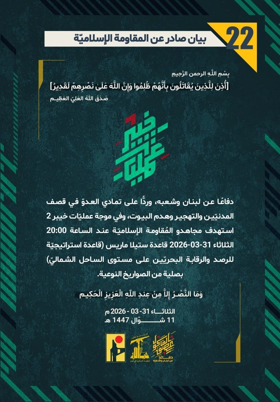 المقاومة الإسلامية بيان رقم (22): استهدفنا قاعدة "ستيلا ماريس" الاستراتيجيّة للرصد والرقابة البحريّين على مستوى الساحل الشمالي بصلية من الصواريخ النوعية
