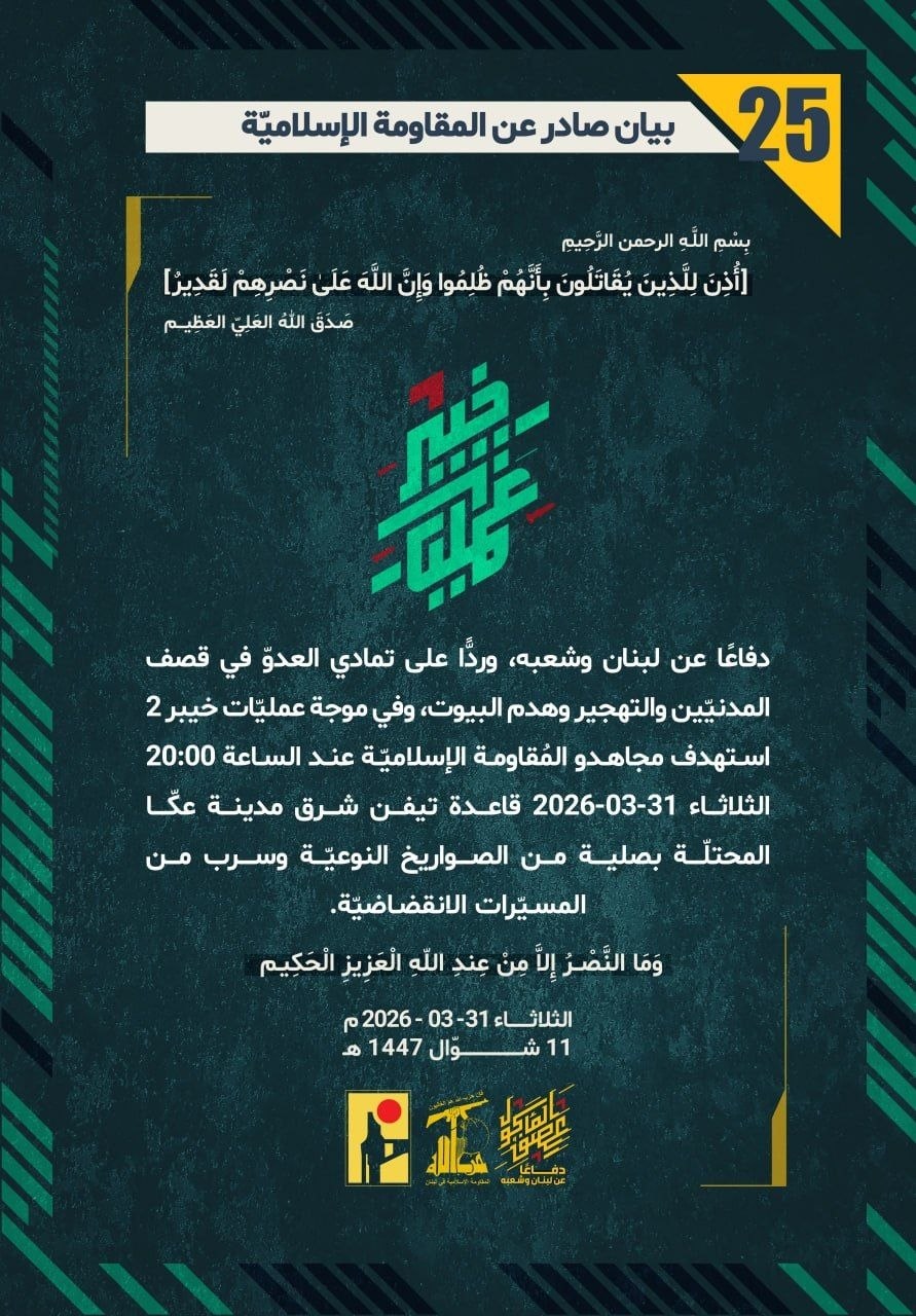 المقاومة الإسلامية بيان رقم (25): استهدفنا بُنى تحتيّة تتبع لجيش العدو "الإسرائيلي" في "الكريوت" شمال مدينة حيفا المحتلّة بصلية صاروخية