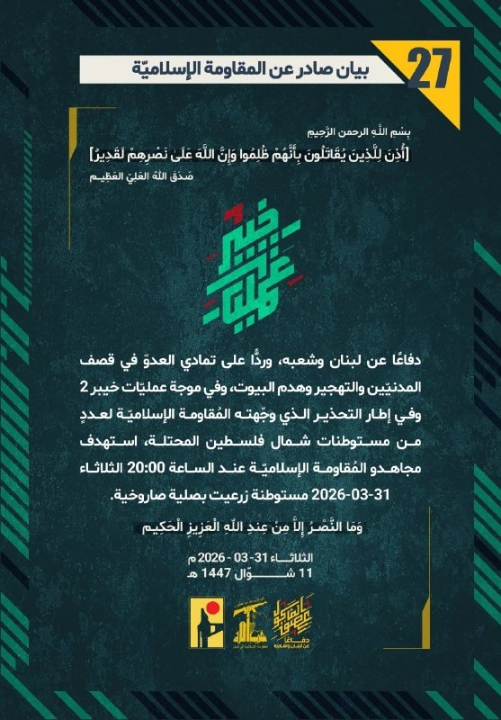 المقاومة الإسلامية بيان رقم (27): استهدفنا مستوطنة "زرعيت" شمال فلسطين المحتلة بصلية صاروخية
