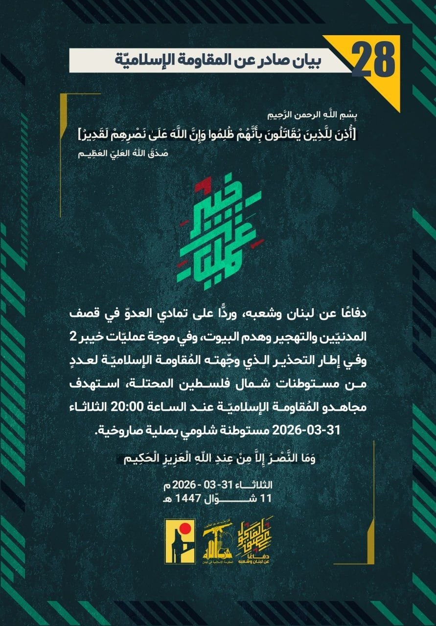 المقاومة الإسلامية بيان رقم (28): استهدفنا مستوطنة "شلومي" شمال فلسطين المحتلة بصلية صاروخية