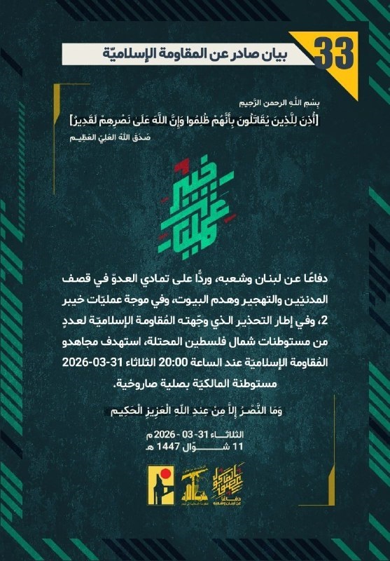 المقاومة الإسلامية بيان رقم (33): استهدفنا مستوطنة "المالكيّة" شمال فلسطين المحتلة بصلية صاروخية