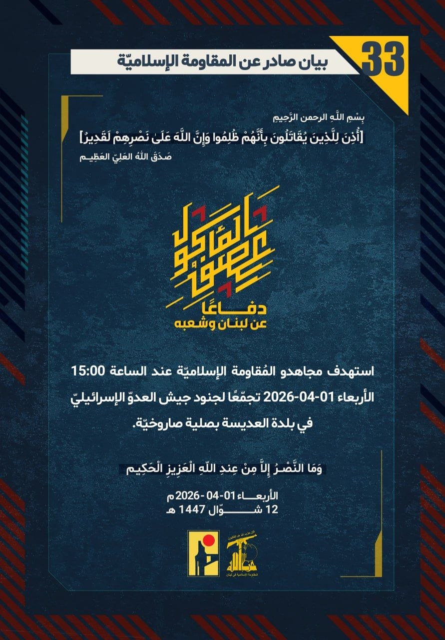 المقاومة الإسلامية بيان رقم (33): استهدفنا عند الساعة 15:00 الأربعاء 01-04-2026 تجمّعًا لجنود جيش العدوّ الإسرائيليّ في بلدة العديسة بصلية صاروخيّة
