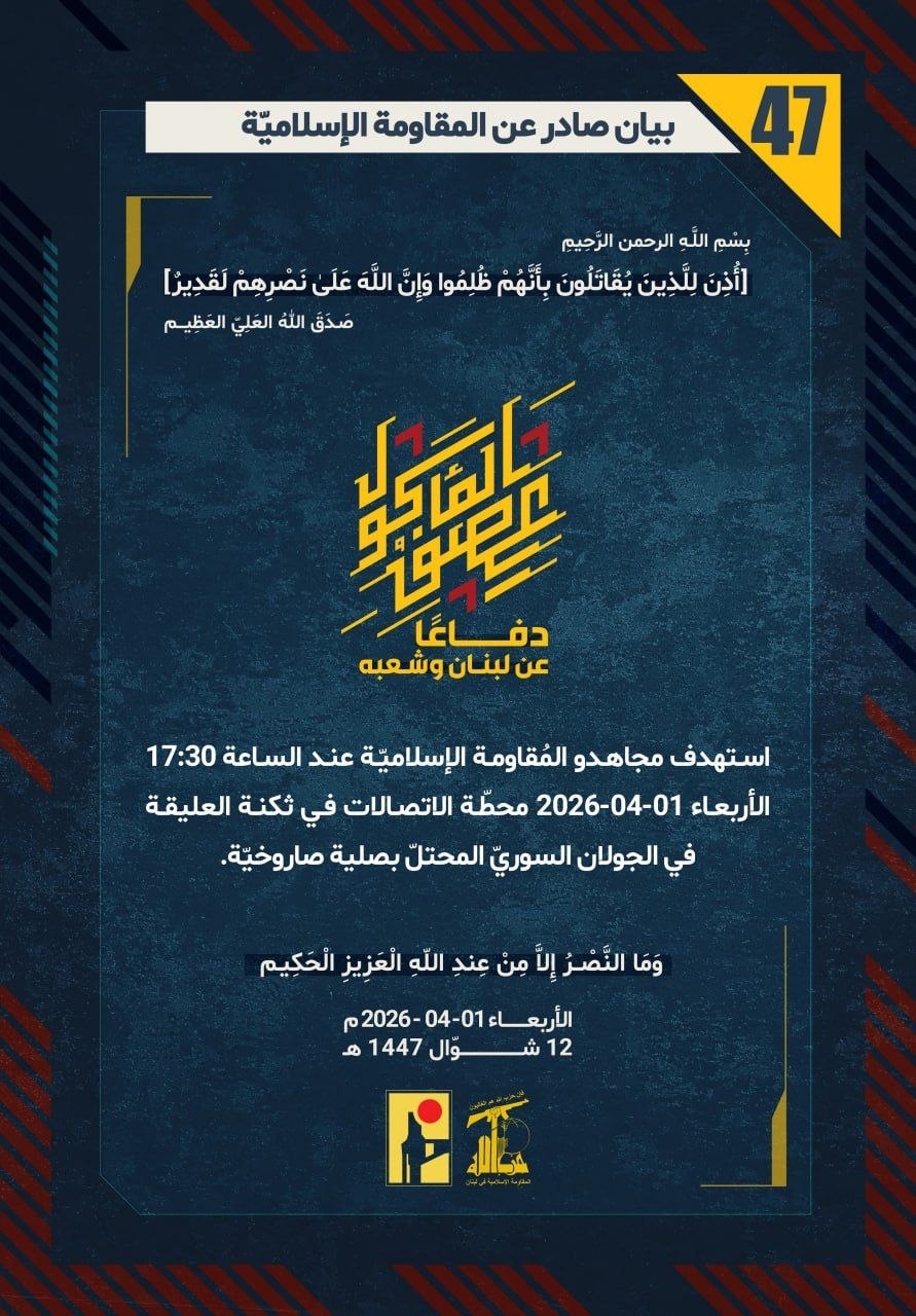 المقاومة الإسلامية بيان رقم (47): استهدفنا عند الساعة 17:30 الأربعاء 01-04-2026 محطّة الاتصالات في ثكنة العليقة في الجولان السوريّ المحتلّ بصلية صاروخيّة