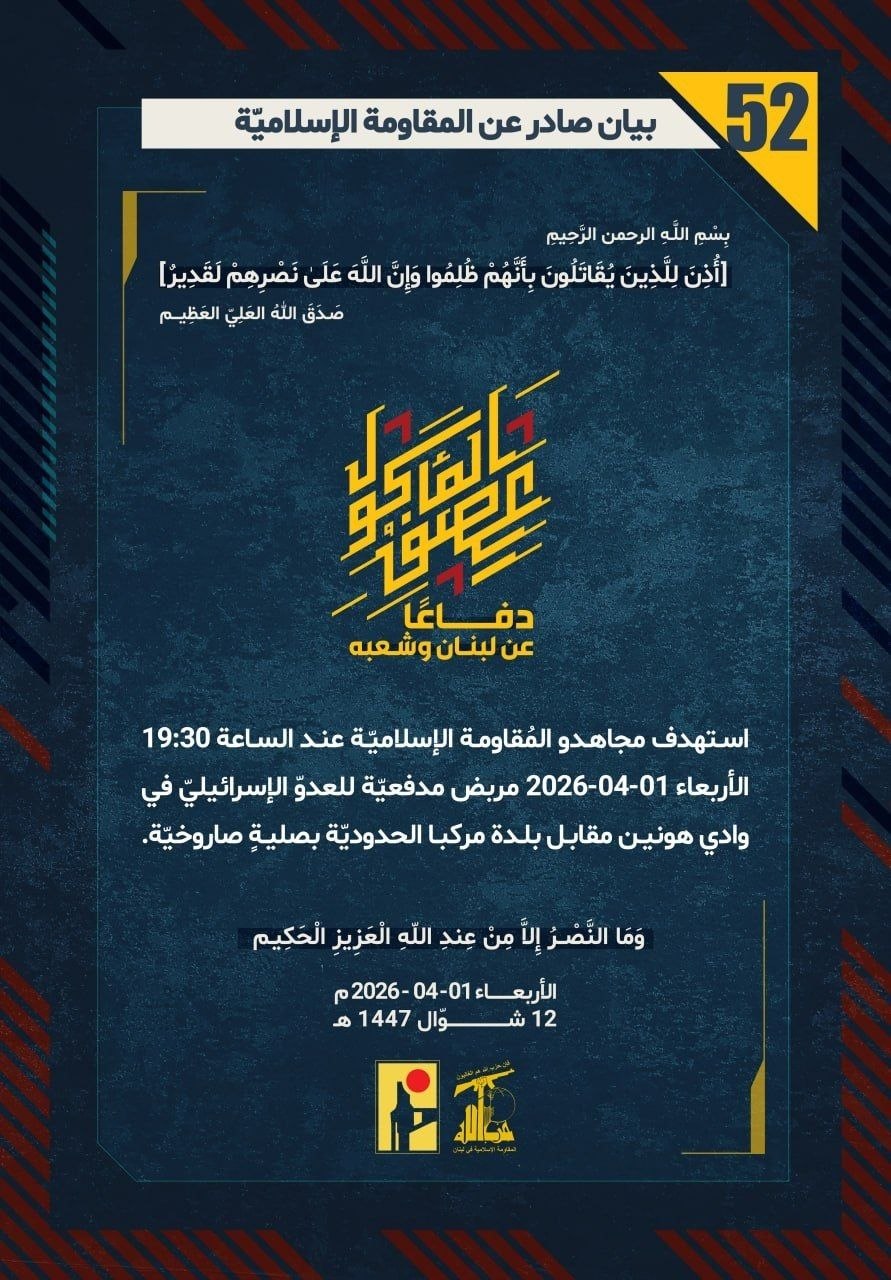 دفاعًا عن لبنان وشعبه، استهدف مجاهدو المُقاومة الإسلاميّة عند الساعة 19:30 الأربعاء 01-04-2026 مربض مدفعيّة للعدوّ الإسرائيليّ في وادي هونين مقابل بلدة مركبا الحدوديّة بصليةٍ صاروخيّة.