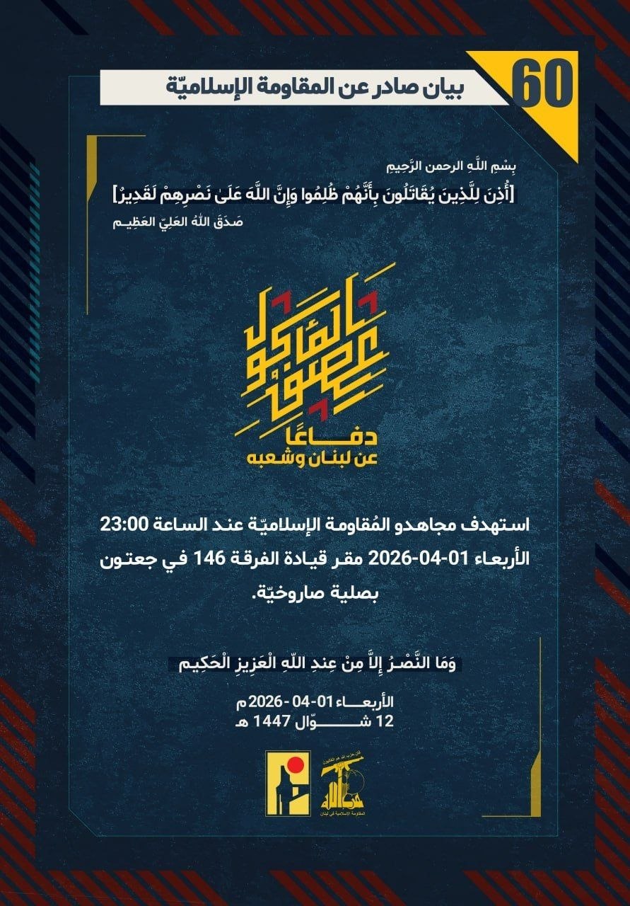دفاعًا عن لبنان وشعبه، استهدف مجاهدو المُقاومة الإسلاميّة عند الساعة 23:00 الأربعاء 01-04-2026 مقر قيادة الفرقة 146 في جعتون بصلية صاروخيّة.