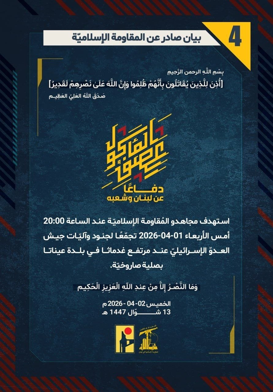 دفاعًا عن لبنان وشعبه، استهدف مجاهدو المُقاومة الإسلاميّة عند الساعة 20:00 أمس الأربعاء 01-04-2026 تجمّعًا لجنود وآليّات جيش العدوّ الإسرائيليّ عند مرتفع غدماثا في بلدة عيناتا بصلية صاروخيّة.