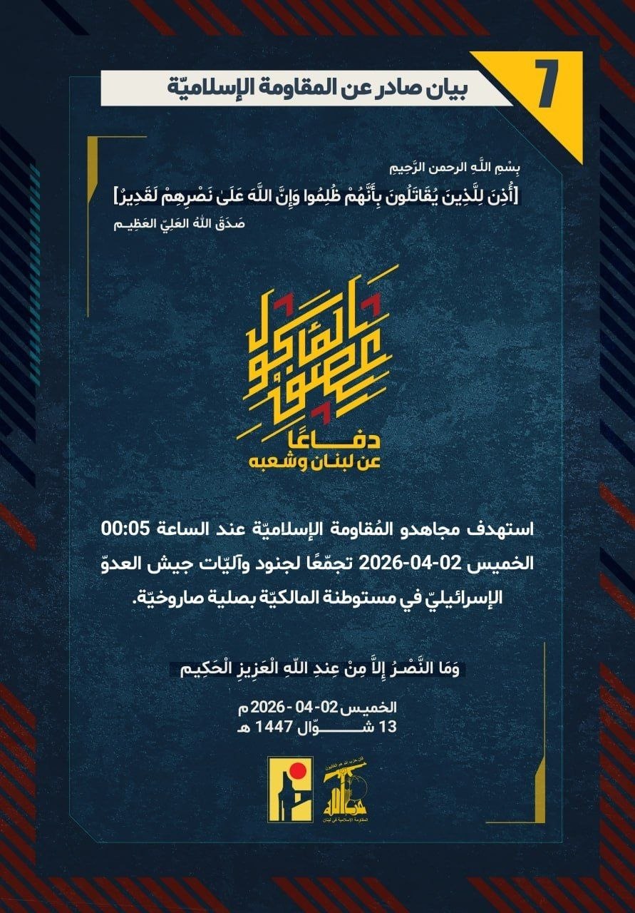 دفاعًا عن لبنان وشعبه، استهدف مجاهدو المُقاومة الإسلاميّة عند الساعة 00:05 الخميس 02-04-2026 تجمّعًا لجنود وآليّات جيش العدوّ الإسرائيليّ في مستوطنة المالكيّة بصلية صاروخيّة.