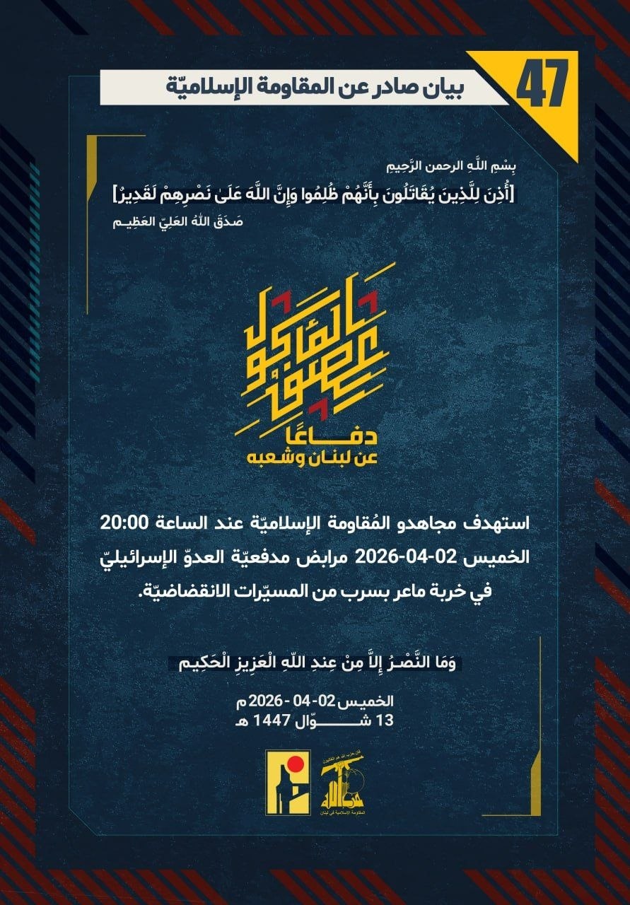 المقاومة الإسلامية بيان رقم (47): استهدفنا مرابض مدفعية العدو "الإسرائيلي" في "خربة ماعر" في الجليل الغربي بسرب من المُسيَّرات الانقضاضية