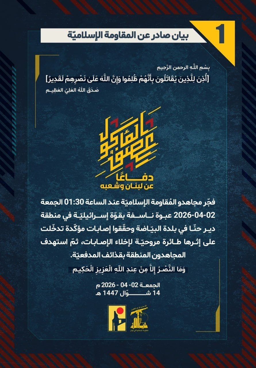 دفاعًا عن لبنان وشعبه، فجّر مجاهدو المُقاومة الإسلاميّة عند الساعة 01:30 الجمعة 02-04-2026 عبوة ناسفة بقوّة إسرائيليّة في منطقة دير حنّا في بلدة البيّاضة وحقّقوا إصابات مؤكّدة تدخّلت على إثرها طائرة مروحيّة لإخلاء الإصابات، ثمّ استهدف المجاهدون المنطقة بقذائف المدفعيّة.