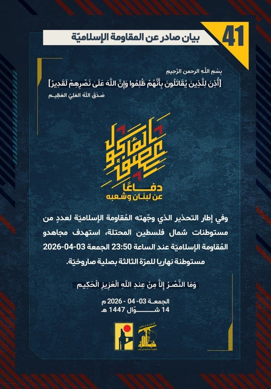 دفاعًا عن لبنان وشعبه، وفي إطار التحذير الذي وجّهته المُقاومة الإسلاميّة لعددٍ من مستوطنات شمال فلسطين المحتلة، استهدف مجاهدو المُقاومة الإسلاميّة عند الساعة 23:50 الجمعة 03-04-2026 مستوطنة نهاريا للمرّة الثالثة بصلية صاروخيّة.