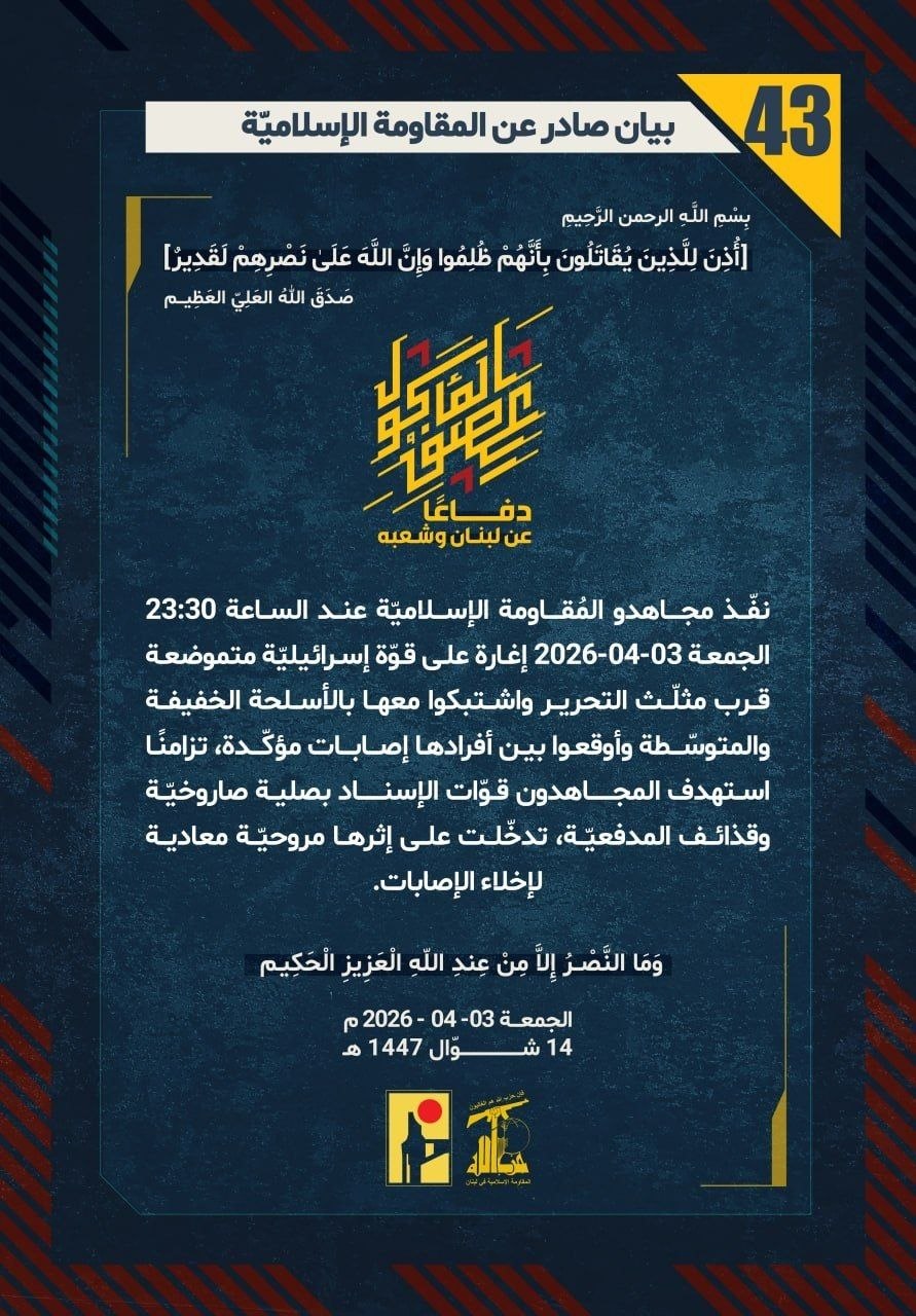 دفاعًا عن لبنان وشعبه، نفّذ مجاهدو المُقاومة الإسلاميّة عند الساعة 23:30 الجمعة 03-04-2026 إغارة على قوّة إسرائيليّة متموضعة قرب مثلّث التحرير واشتبكوا معها بالأسلحة الخفيفة والمتوسّطة وأوقعوا بين أفرادها إصابات مؤكّدة، تزامنًا استهدف المجاهدون قوّات الإسناد بصلية صاروخيّة وقذائف المدفعيّة، تدخّلت على إثرها مروحيّة معادية لإخلاء الإصابات.