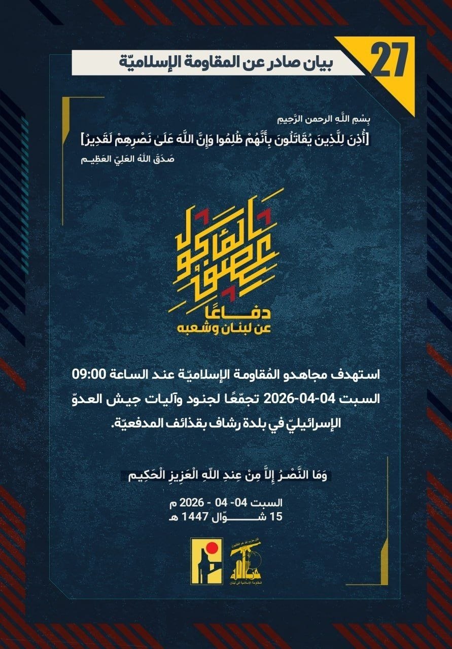 المقاومة الإسلامية بيان رقم (27): استهدفنا تجمّعًا لجنود وآليات جيش العدو "الإسرائيلي" في بلدة رشاف بقذائف المدفعية