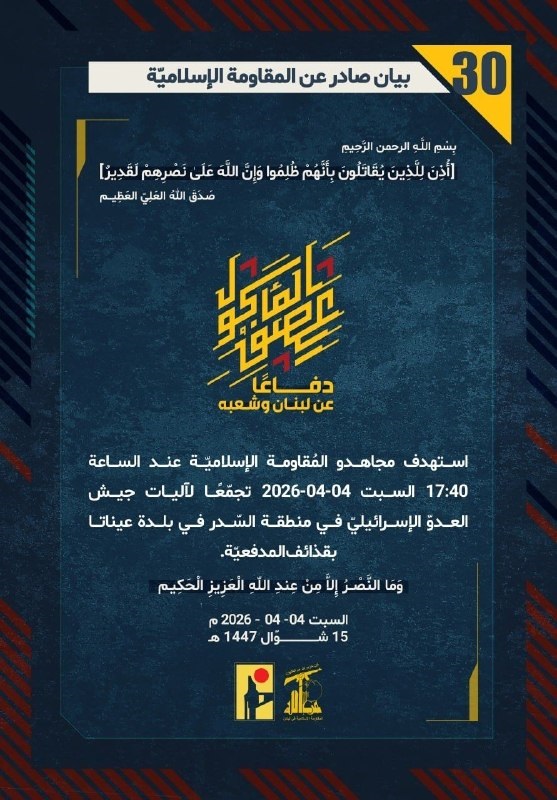 المقاومة الإسلامية بيان رقم (30): استهدفنا تجمّعًا لآليات جيش العدو "الإسرائيلي" في "منطقة السّدر" في بلدة عيناتا بقذائف المدفعية