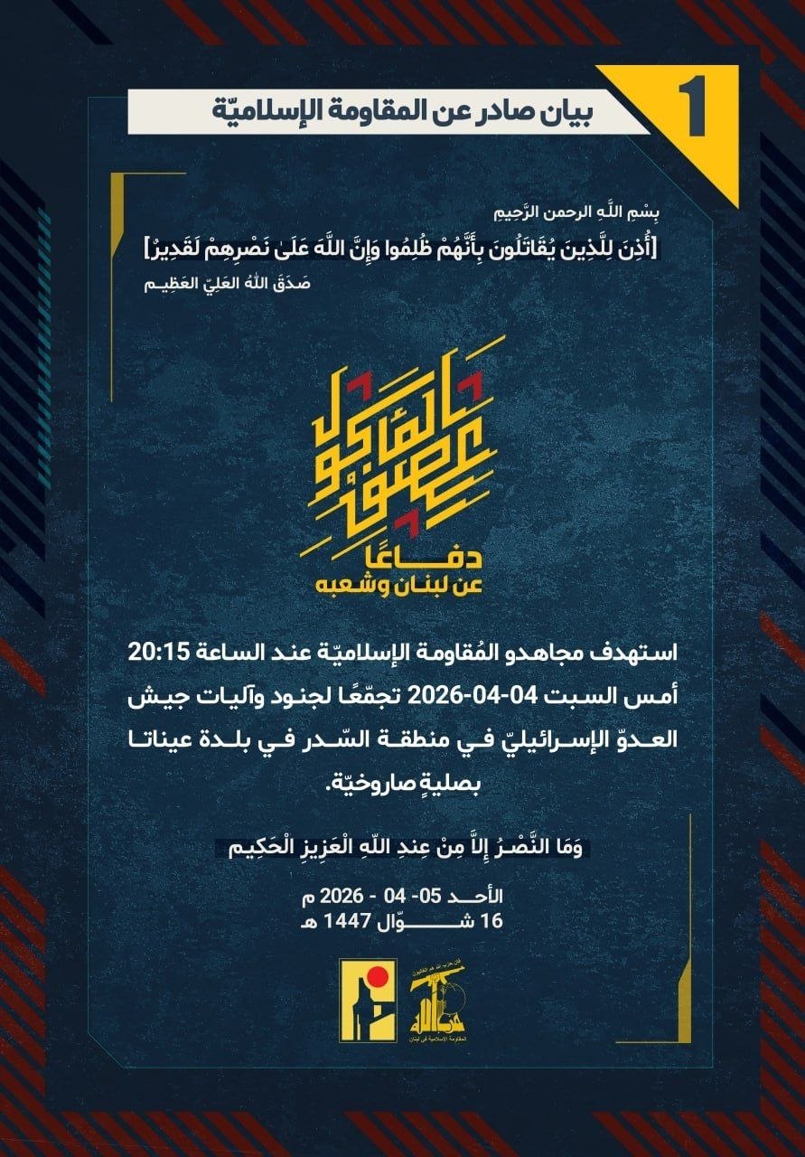 المقاومة الإسلامية بيان رقم (1): استهدف مجاهدو المُقاومة الإسلاميّة عند الساعة 20:15 أمس السبت 04-04-2026 تجمّعًا لجنود وآليات جيش العدوّ "الإسرائيليّ" في منطقة السّدر في بلدة عيناتا بصليةٍ صاروخيّة