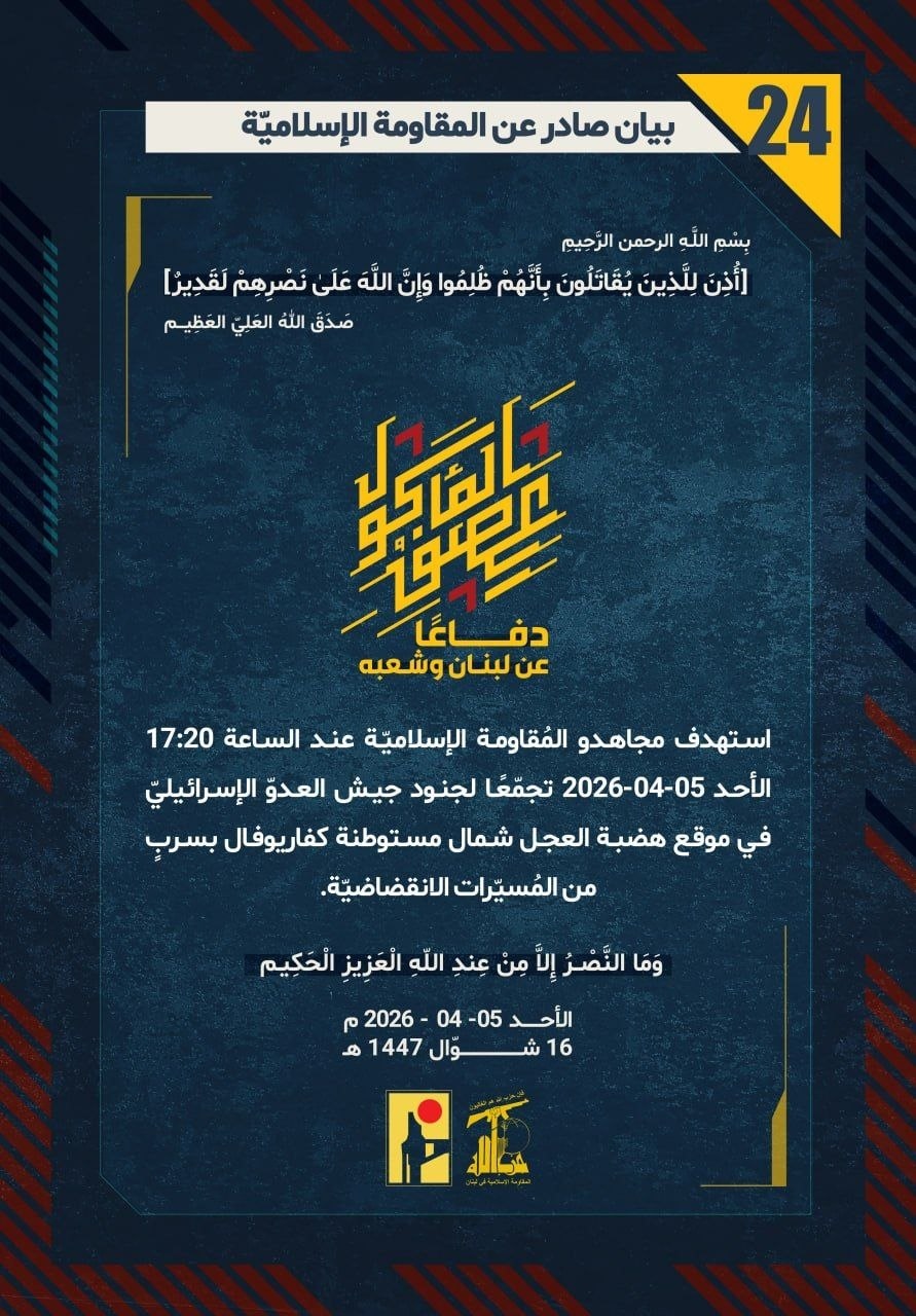 المقاومة الإسلامية بيان رقم (24): استهدفنا بسرب من المُسيَّرات الانقضاضية تجمّعًا لجنود جيش العدو "الإسرائيلي" في موقع "هضبة العجل" شمال مستوطنة "كفار يوفال" شمال فلسطين المحتلة