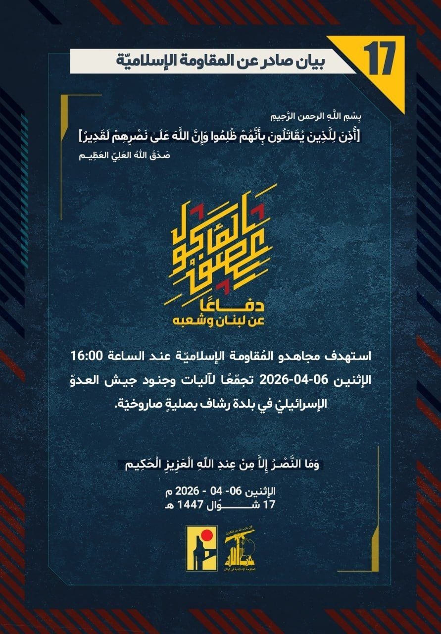 المقاومة الإسلامية بيان رقم (17): استهدفنا تجمّعًا لآليات وجنود جيش العدوّ "الإسرائيليّ" في بلدة رشاف بصليةٍ صاروخيّة