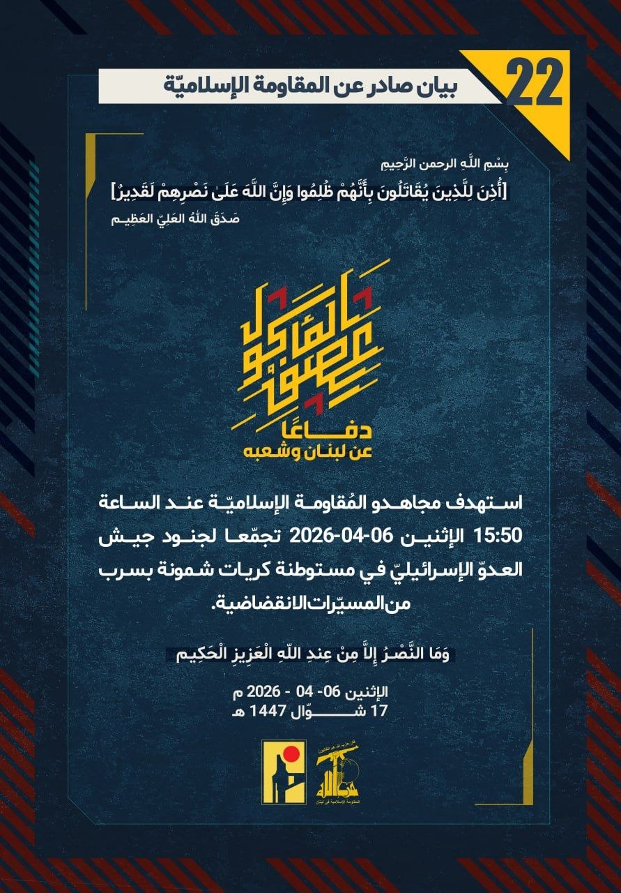 المقاومة الإسلامية بيان رقم (22): استهدفنا تجمّعًا لجنود جيش العدوّ الإسرائيليّ في مستوطنة كريات شمونة بسرب من المسيّرات الانقضاضية