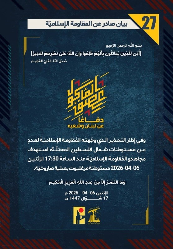 المقاومة الإسلامية بيان رقم (27): استهدفنا مستوطنة "مرغليوت" شمال فلسطين المحتلّة بصلية صاروخية