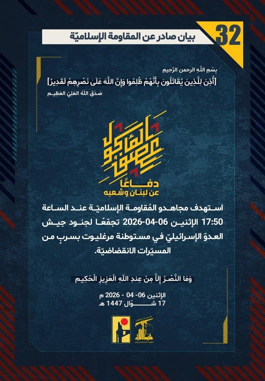 المقاومة الإسلامية بيان رقم (32): استهدفنا تجمّعًا لجنود جيش العدو "الإسرائيلي" في مستوطنة "مرغليوت" شمال فلسطين المحتلة بسرب من المُسيَّرات الانقضاضية