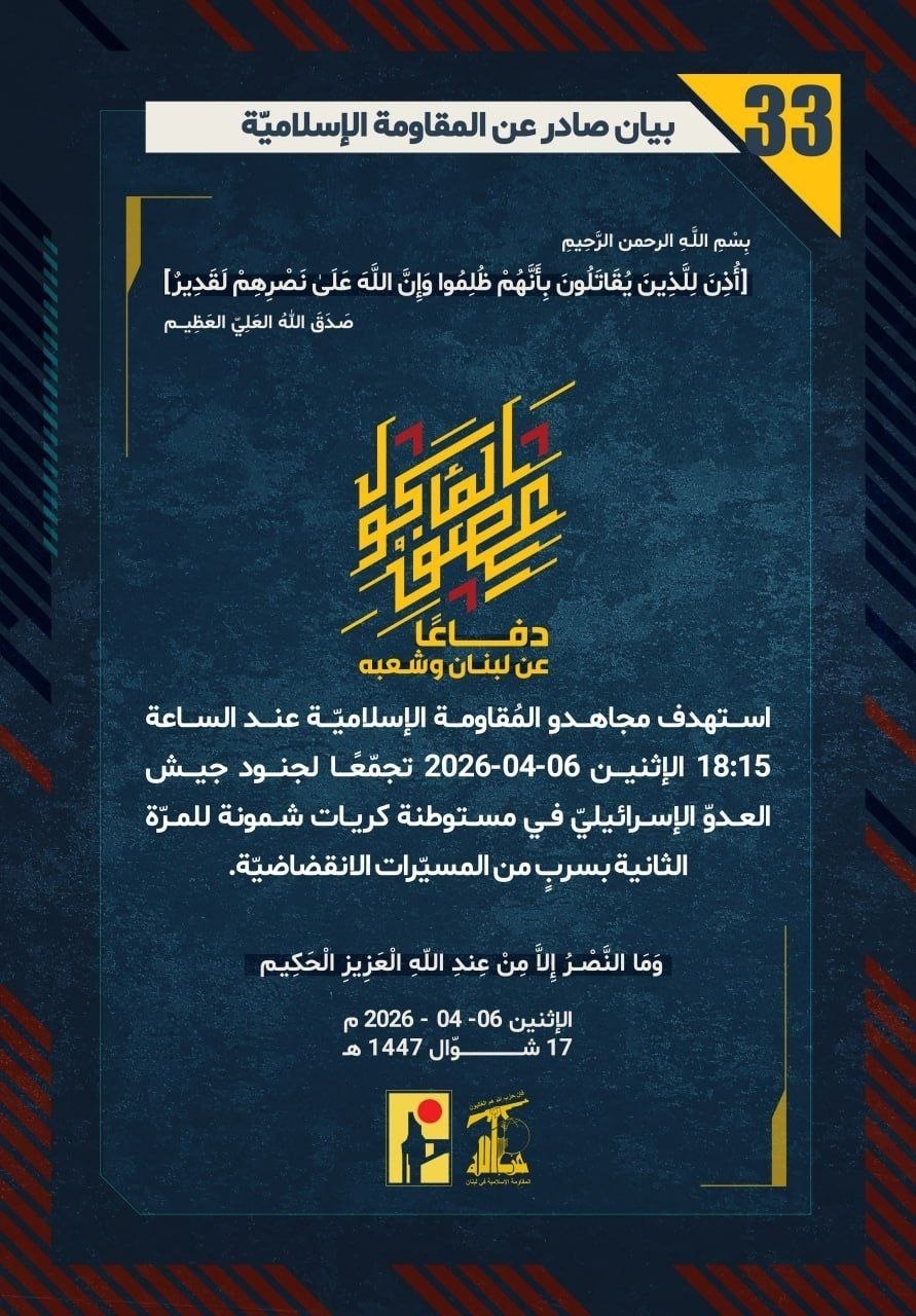 المقاومة الإسلامية بيان رقم (33): استهدفنا تجمّعًا لجنود جيش العدو "الإسرائيلي" في مستوطنة "كريات شمونة" شمال فلسطين المحتلة بسرب من المُسيَّرات الانقضاضية