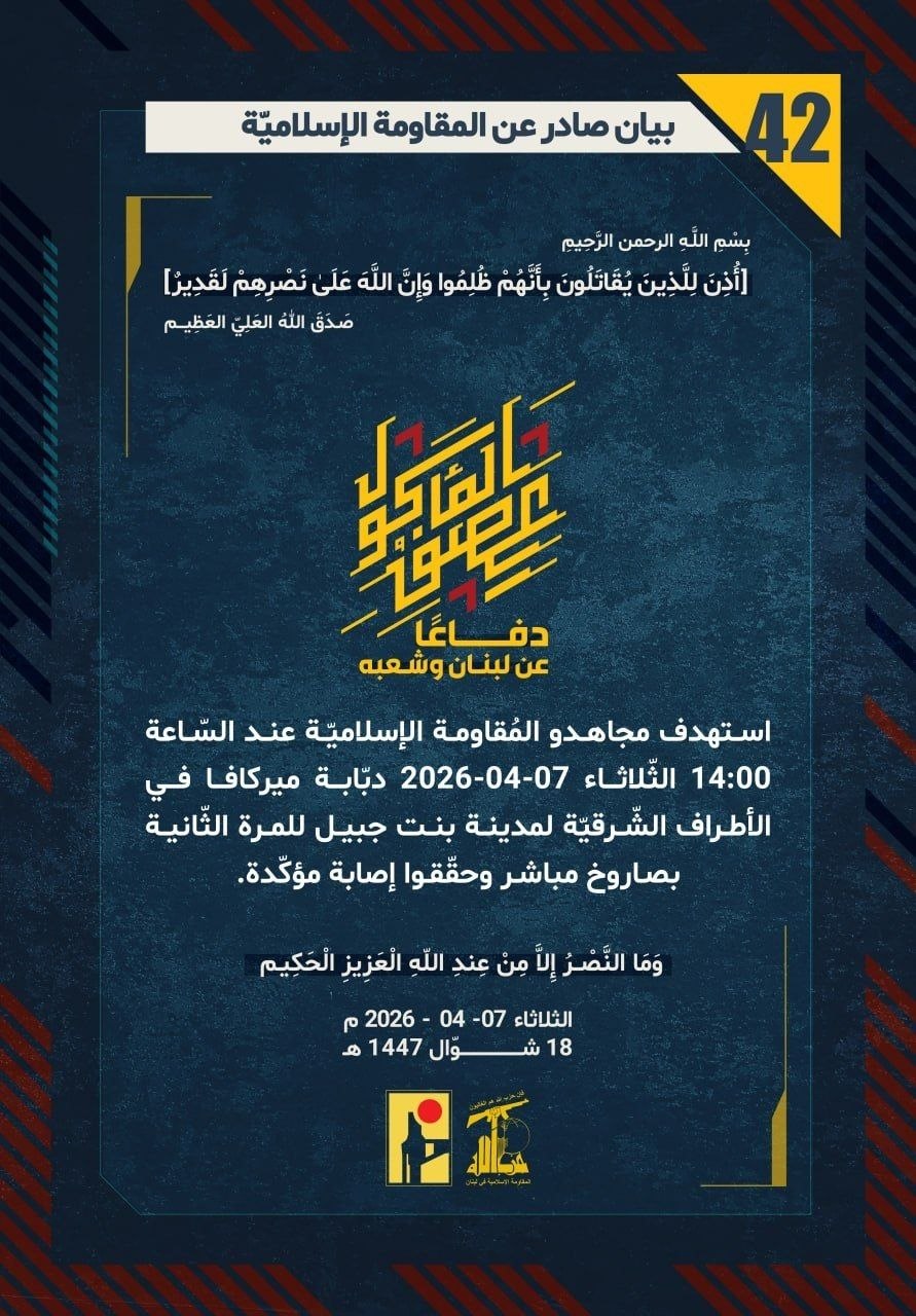 المقاومة الإسلامية بيان رقم (42): استهدفنا عند السّاعة 14:00 الثّلاثاء 07-04-2026 دبّابة ميركافا في الأطراف الشّرقيّة لمدينة بنت جبيل للمرة الثّانية بصاروخ مباشر وحقّقوا إصابة مؤكّدة