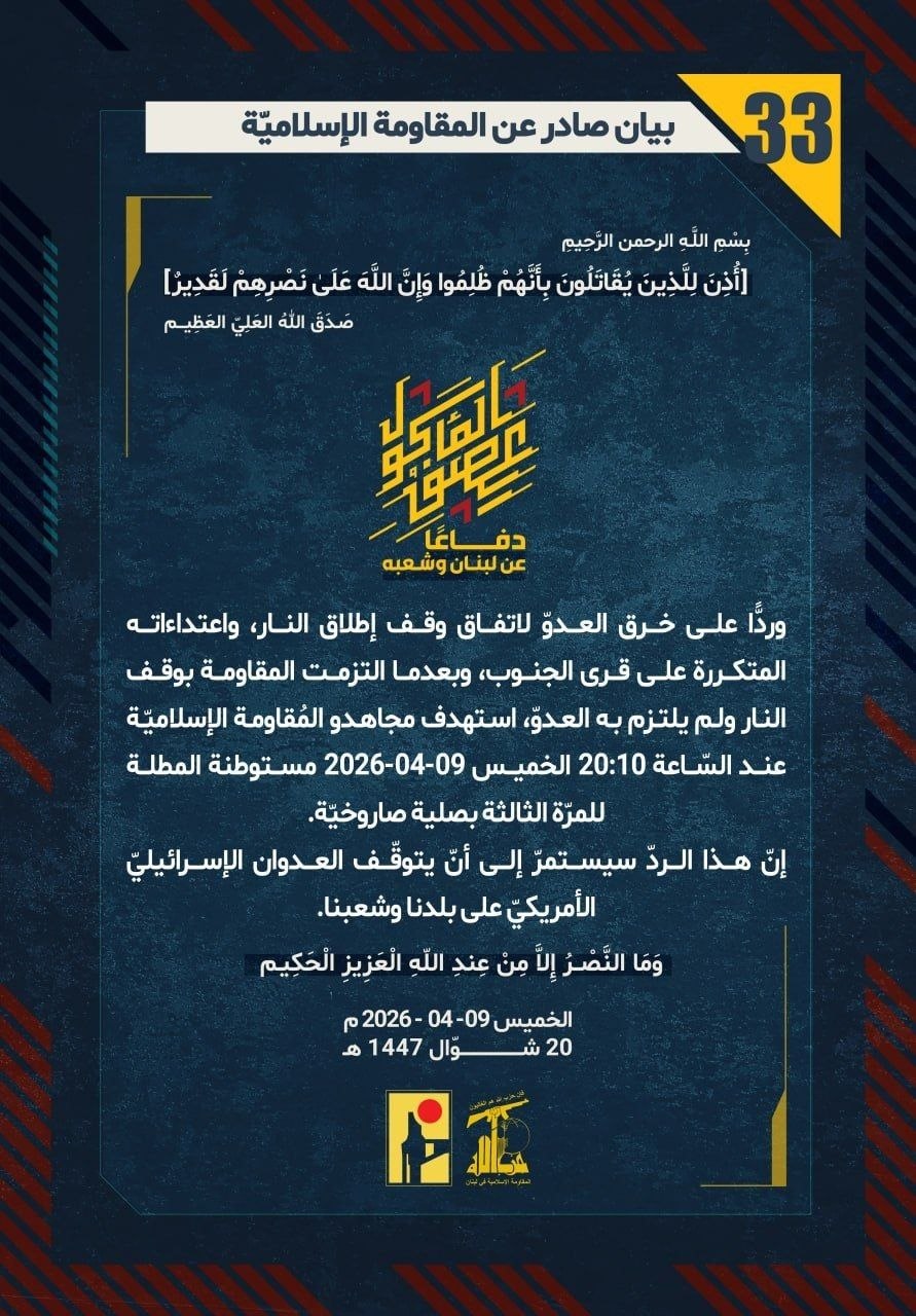 دفاعًا عن لبنان وشعبه، وردًّا على خرق العدوّ لاتفاق وقف إطلاق النار، واعتداءاته المتكررة على قرى الجنوب، وبعدما التزمت المقاومة بوقف النار ولم يلتزم به العدوّ، استهدف مجاهدو المُقاومة الإسلاميّة عند السّاعة 20:10 الخميس 09-04-2026 مستوطنة المطلة للمرّة الثالثة بصلية صاروخيّة.