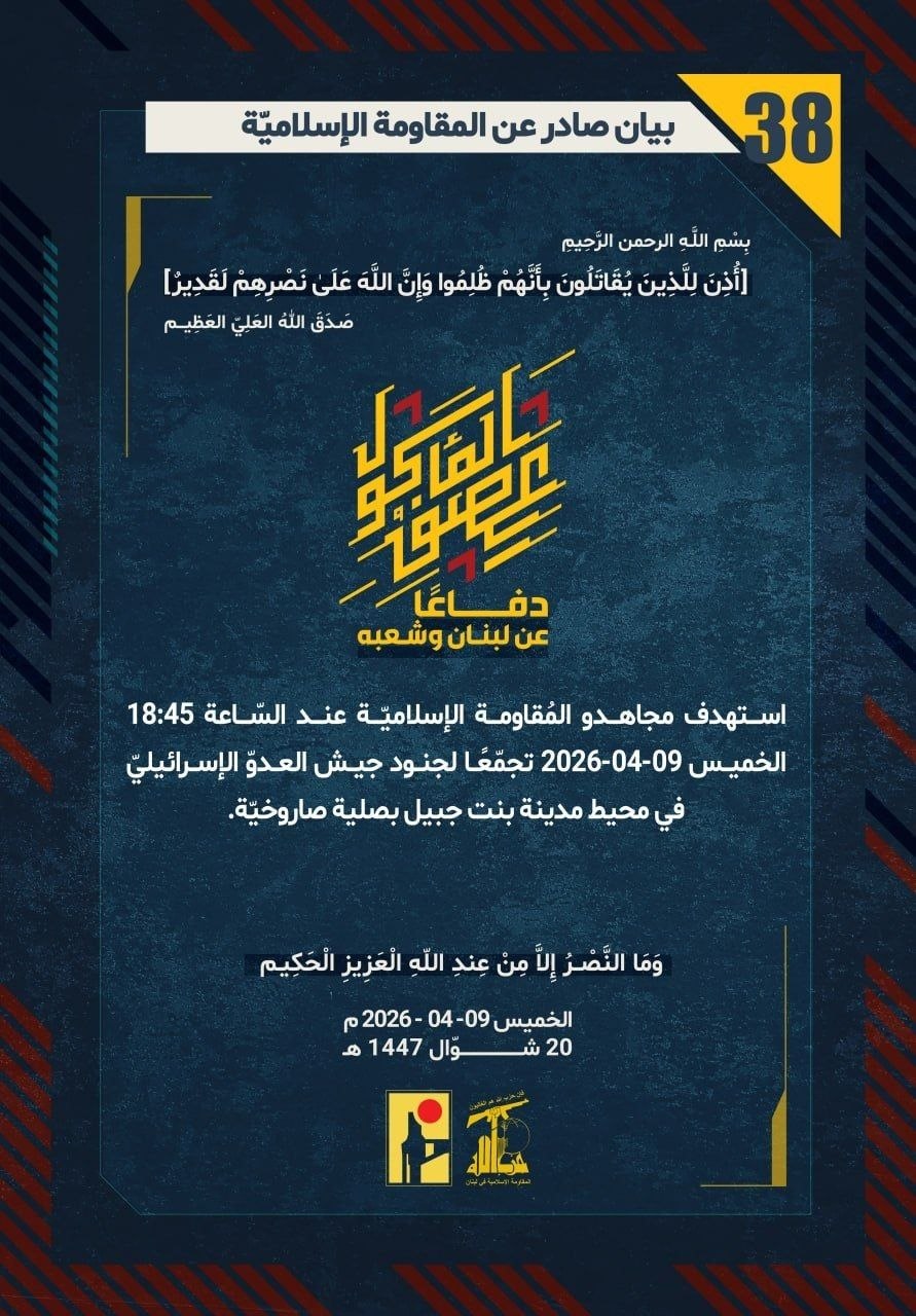 دفاعًا عن لبنان وشعبه، استهدف مجاهدو المُقاومة الإسلاميّة عند السّاعة 18:45 الخميس 09-04-2026 تجمّعًا لجنود جيش العدوّ الإسرائيليّ في محيط مدينة بنت جبيل بصلية صاروخيّة.