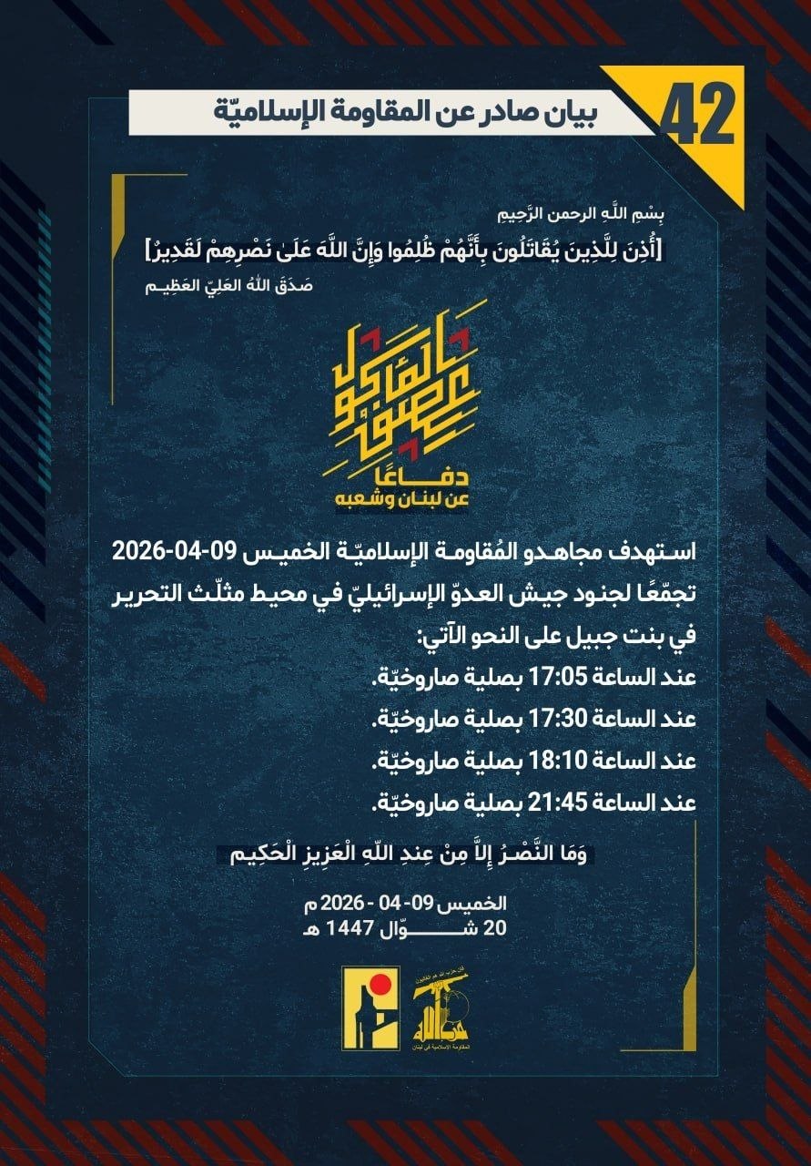 دفاعًا عن لبنان وشعبه، استهدف مجاهدو المُقاومة الإسلاميّة الخميس 09-04-2026 تجمّعًا لجنود جيش العدوّ الإسرائيليّ في محيط مثلّث التحرير عند أطراف مدينة بنت جبيل على النحو الآتي: