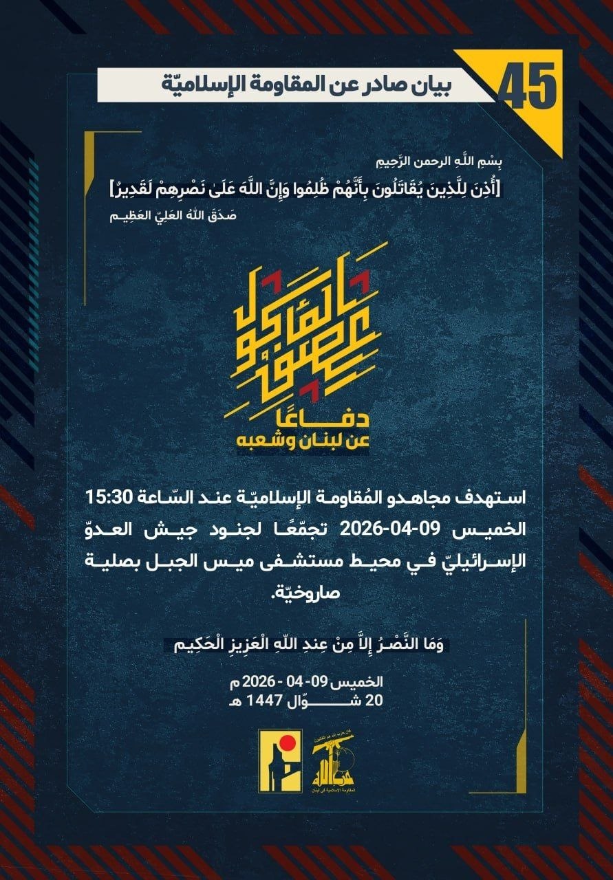 دفاعًا عن لبنان وشعبه، استهدف مجاهدو المُقاومة الإسلاميّة عند السّاعة 15:30 الخميس 09-04-2026 تجمّعًا لجنود جيش العدوّ الإسرائيليّ في محيط مستشفى ميس الجبل بصلية صاروخيّة.