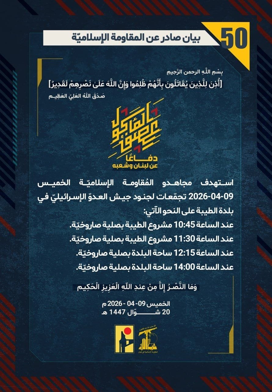 دفاعًا عن لبنان وشعبه، استهدف مجاهدو المُقاومة الإسلاميّة الخميس 09-04-2026 تجمّعات لجنود جيش العدوّ الإسرائيليّ في بلدة الطيبة على النحو الآتي: