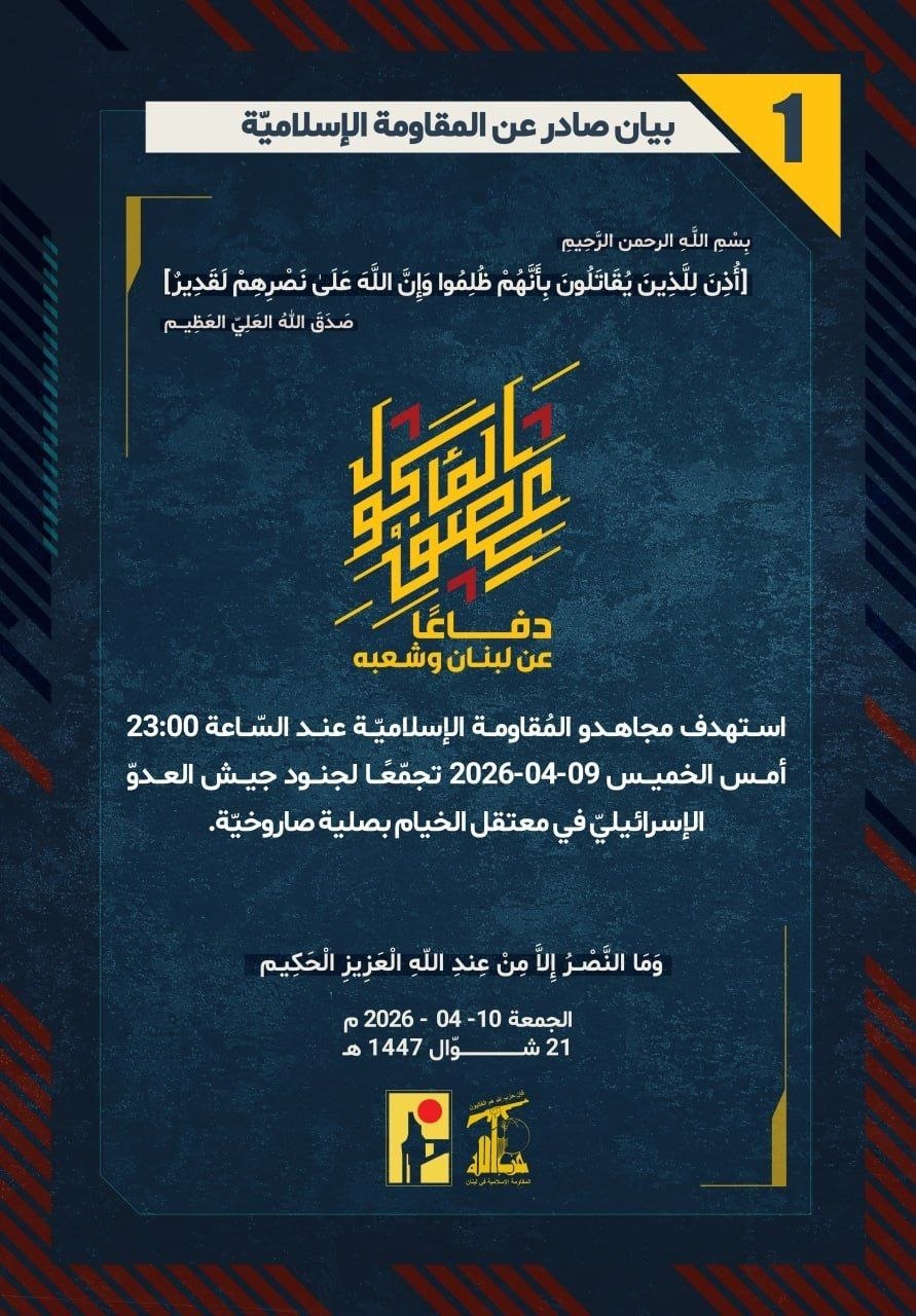 دفاعًا عن لبنان وشعبه، استهدف مجاهدو المُقاومة الإسلاميّة عند السّاعة 23:00 أمس الخميس 09-04-2026 تجمّعًا لجنود جيش العدوّ الإسرائيليّ في معتقل الخيام بصلية صاروخيّة.