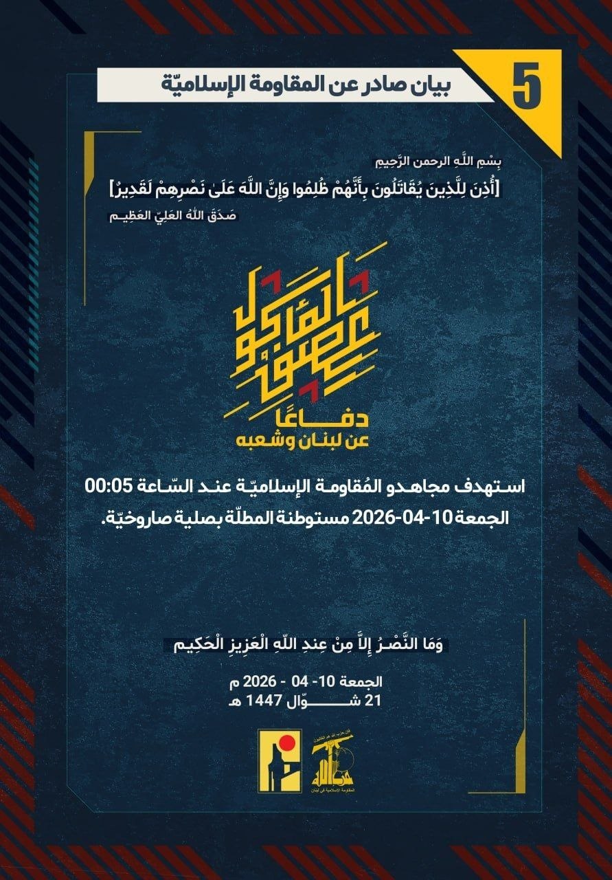 دفاعًا عن لبنان وشعبه، استهدف مجاهدو المُقاومة الإسلاميّة عند السّاعة 00:05 الجمعة 10-04-2026 مستوطنة المطلّة بصلية صاروخيّة.