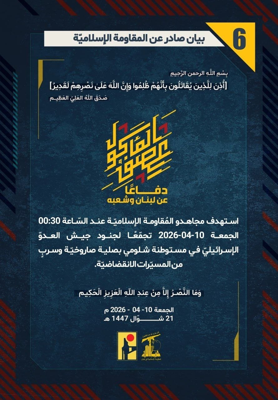 دفاعًا عن لبنان وشعبه، استهدف مجاهدو المُقاومة الإسلاميّة عند السّاعة 00:30 الجمعة 10-04-2026 تجمّعًا لجنود جيش العدوّ الإسرائيليّ في مستوطنة شلومي بصلية صاروخيّة وسربٍ من المسيّرات الانقضاضيّة.