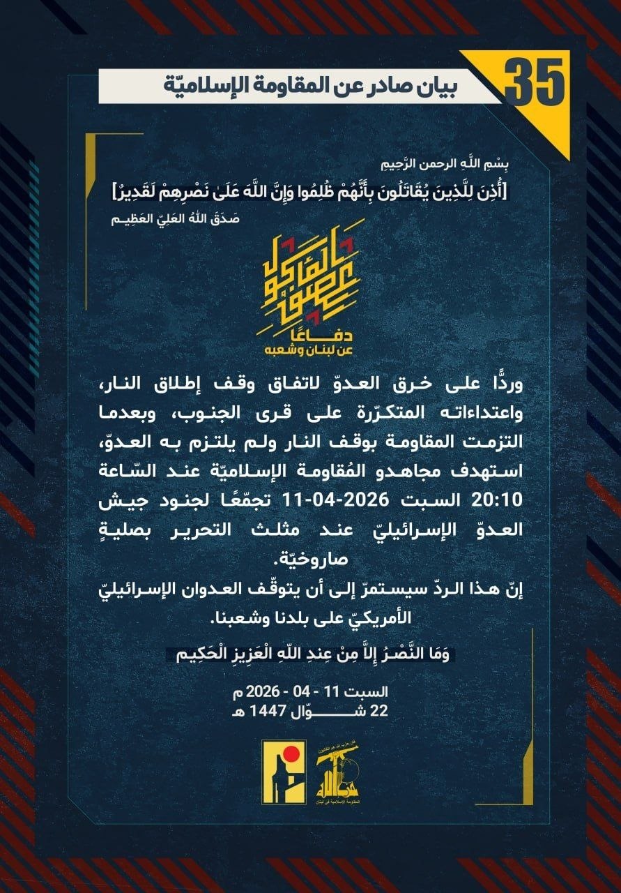 المقاومة الإسلامية بيان (35): استهدف مجاهدو المُقاومة الإسلاميّة عند السّاعة 20:10 السبت 11-04-2026 تجمّعًا لجنود جيش العدوّ "الإسرائيليّ" عند مثلث التحرير بصليةٍ صاروخيّة