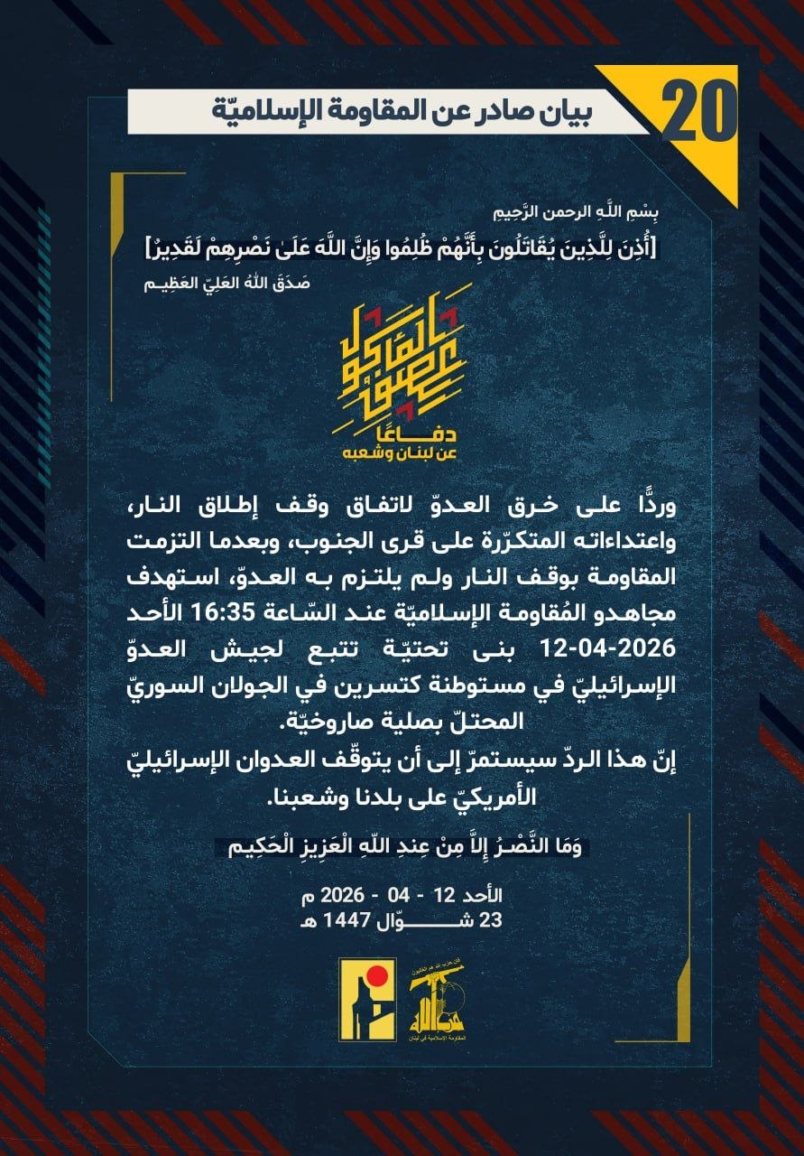 المقاومة الإسلامية بيان رقم (20): استهدفنا بنى تحتيّة تتبع لجيش العدوّ "الإسرائيليّ" في مستوطنة كتسرين في الجولان السوريّ المحتلّ بصلية صاروخيّة