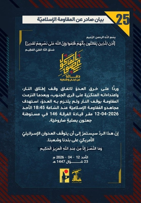 المقاومة الإسلامية بيان رقم (25): استهدفنا بصلية صاروخية مقر قيادة الفرقة 146 في جيش العدو الصهيوني في مستوطنة "جعتون" شمال فلسطين المحتلة