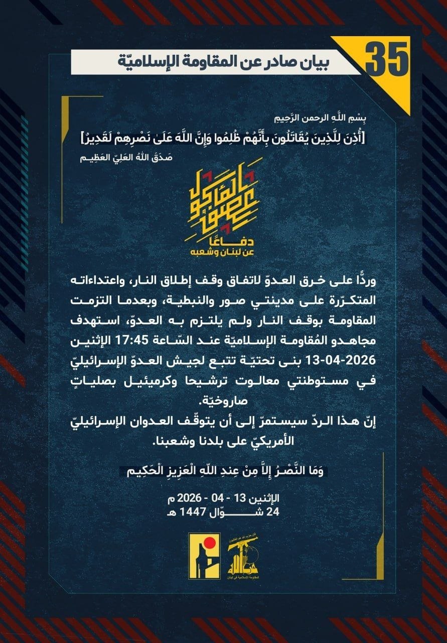 المقاومة الإسلامية بيان (35): استهدفنا بنى تحتيّة تتبع لجيش العدوّ الإسرائيليّ في مستوطنتي معالوت ترشيحا وكرميئيل بصلياتٍ صاروخيّة
